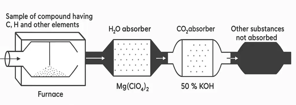 A known amount of organic sample is placed in a combustion tube which is fitted in a furnace. The compound is burnt in the supply of oxygen. Carbon and hydrogen are converted to CO2 and H2O. H2O and CO2 are then absorbed by Mg(CIO4)2 and 50% KOH, respectively. These absorbers are pre-weighed.